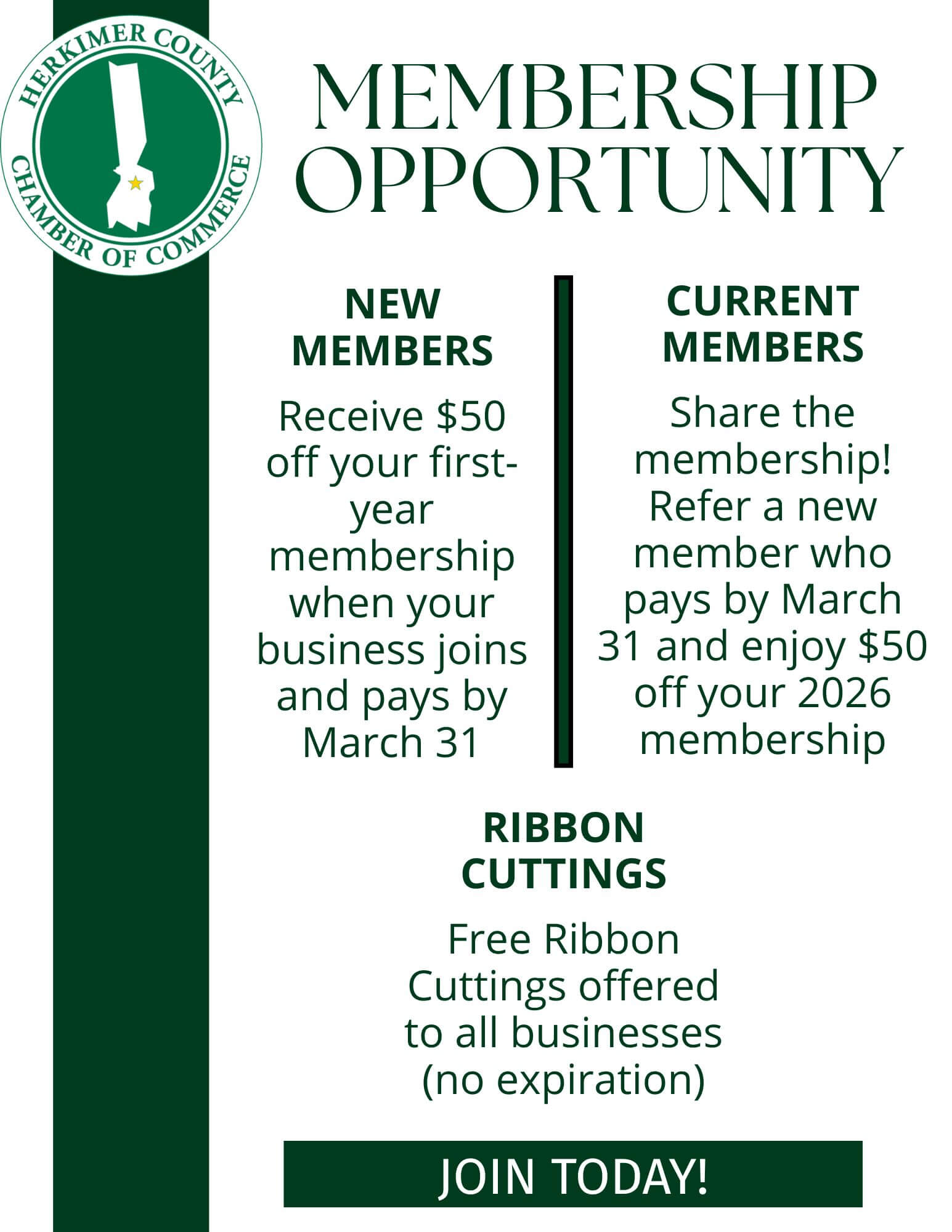 The Herkimer County Chamber of Commerce is a not-for-profit membership organization. The Chamber’s mission is to foster a positive business environment for private and public entities operating in the County to assure the successful continuation of, and growth of, current and new business in our region.